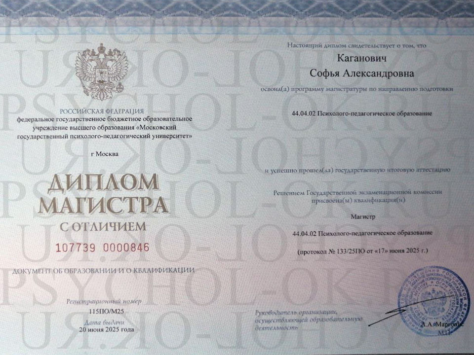 МГУ им. М.В. Ломоносова – факультет психологии, психолог.
